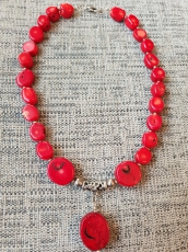1. Bild: rote Koralle, Länge 50cm + 4,50cm Anhänger; CHF 70.00 2. Bild: rote Koralle, Mondstein, Havlit, Amethyst, Jade, Onix, gelbe Jade; Länge 77 cm + 7 cm Anhänger; CHF...