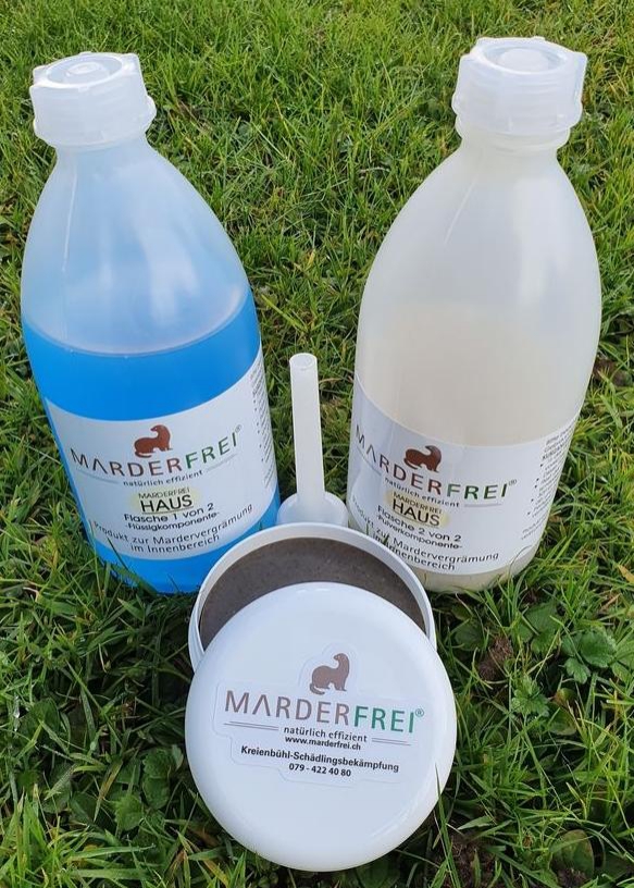Marderfrei Paste ein 100 % biologisches Mittel gegen Marder und den Waschbär an feuchtigkeitsexponierten Stellen, Gartenanlage, Solaranlagen, Photovoltaikanlagen, Fallrohre, Bäume, Sträucher, Treppen, Geländer, Vorplatz, Sitzplatz, Pergola, Carports, Beleuchtungskabel, Gummiteile, Auto, Motorraum, Zündkabel, Ziegel, Gartenhaus, ect.. 1 Dose Marderfrei Paste kostet Fr. 39.90, exklusiv Fr. 9.00 Versandkosten.