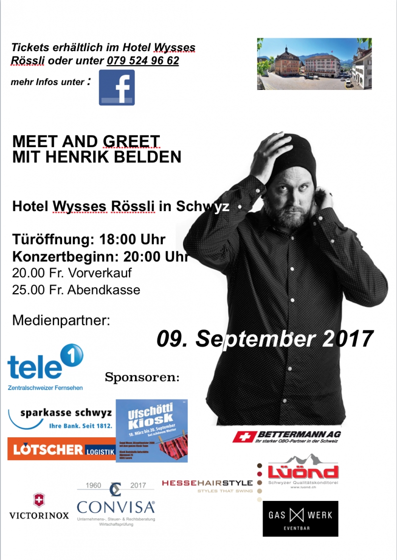 Am 09. September findet im Wysse Rössli Schwyz eine Premiere statt – Schweizer Musiker Henrik Belden hält ein exklusives Meet and Greet. Zu Stande kam der Anlass durch die Abschlussarbeit zum Event-Manager von Patrick Husi, OK-Vorsitzender und ehemaliger Auszubildender im Wysse Rössli Schwyz. Die Gäste haben die Möglichkeit Tickets für ein Package für unschlagbare CHF 65.- zu kaufen, in welchem Konzertticket, ein reichhaltiger Apéro und Getränke inbegriffen sind. Allen anderen Interessierten stehen Tickets für CHF 20.-im Vorverkauf oder CHF 25.- an der Abendkasse zur Verfügung. Das ganze OK freut sich auf zahlreiche Gäste.