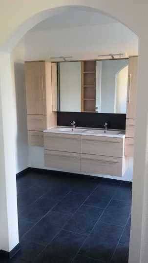 - grosse Dusche mit Doppellavabo, Spiegelschrank, WC