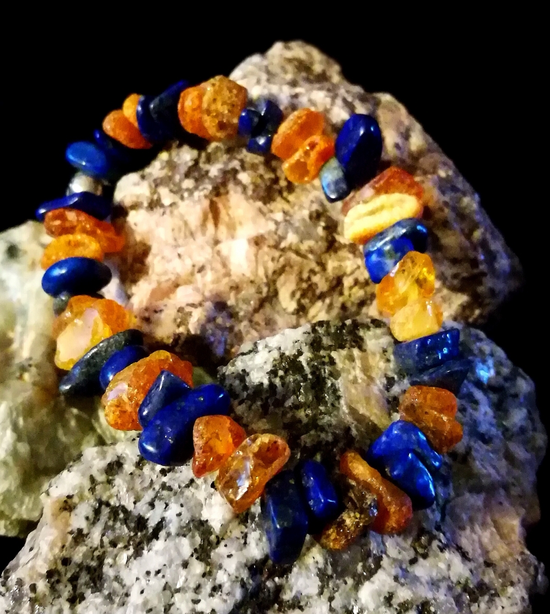 Hübsche rohe Bernstein & Lapislazuli-Splitter auf Stretch gezogen.
