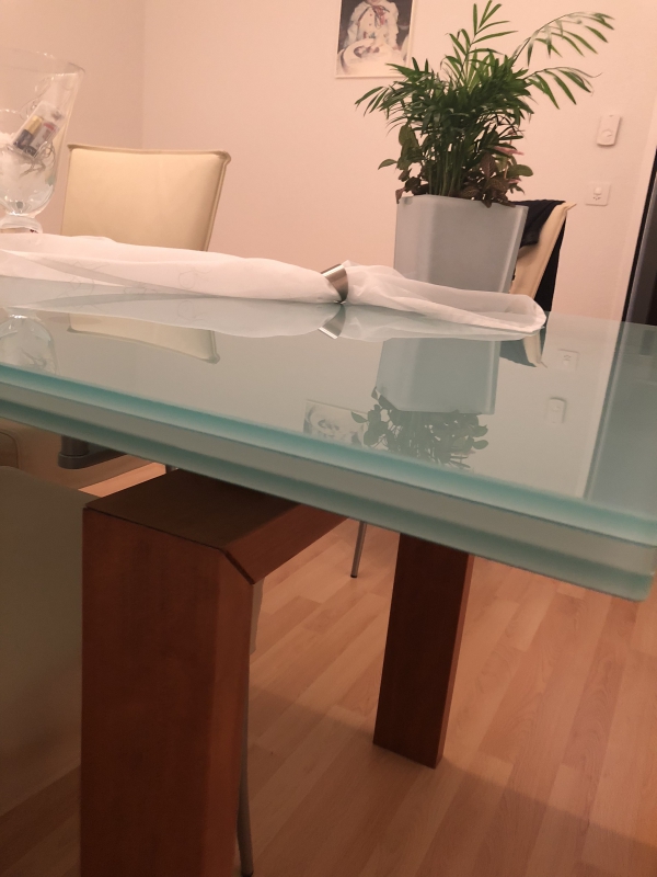 Wenig gebraucht, in sehr guten Zustand, kleine Gebrauchsspuren ersichtlich. Tisch ist mit schönen, stabilen Holzfüsse ausgestattet und kann beidseitig ausgezogen werden.