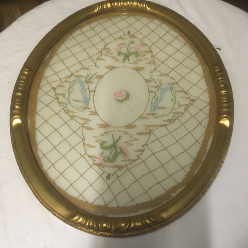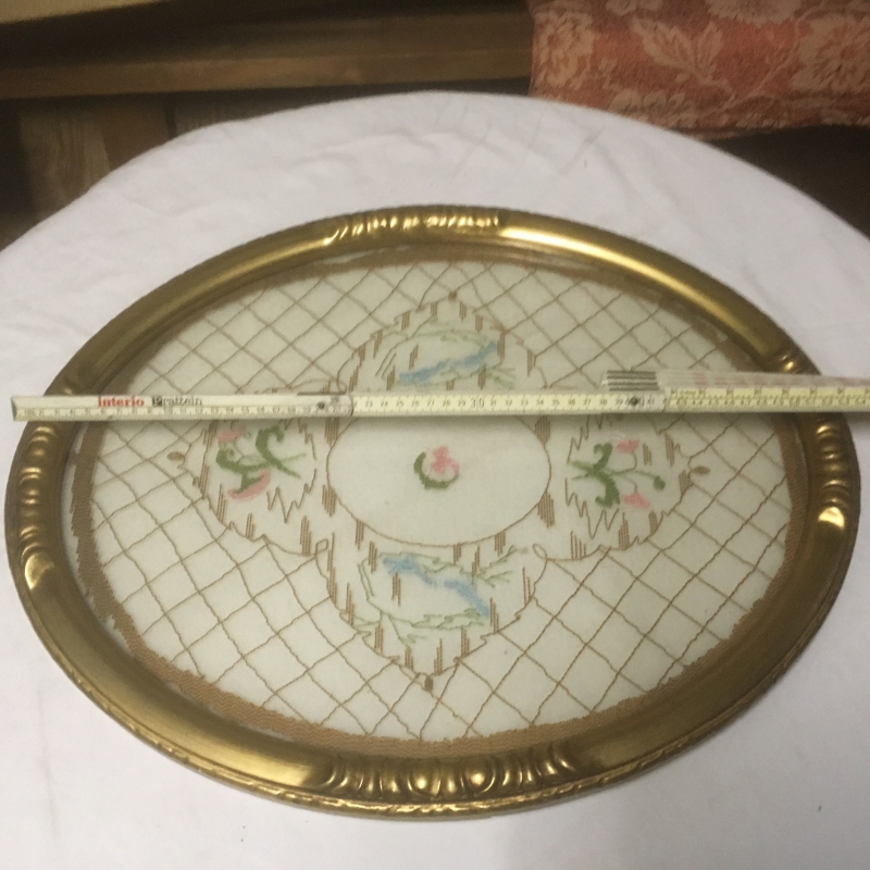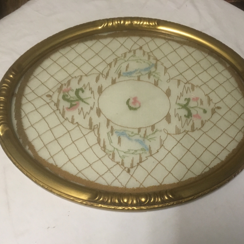 Glasservierbrett mit eingelegter Stickerei, verzierter Goldrahmen.