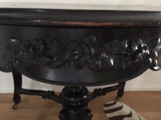 in ovaler Form mit schönen Schnitzereien. Beidseitig eine Schublade und steht auf Räder. Sehr praktisch zum verschieben.