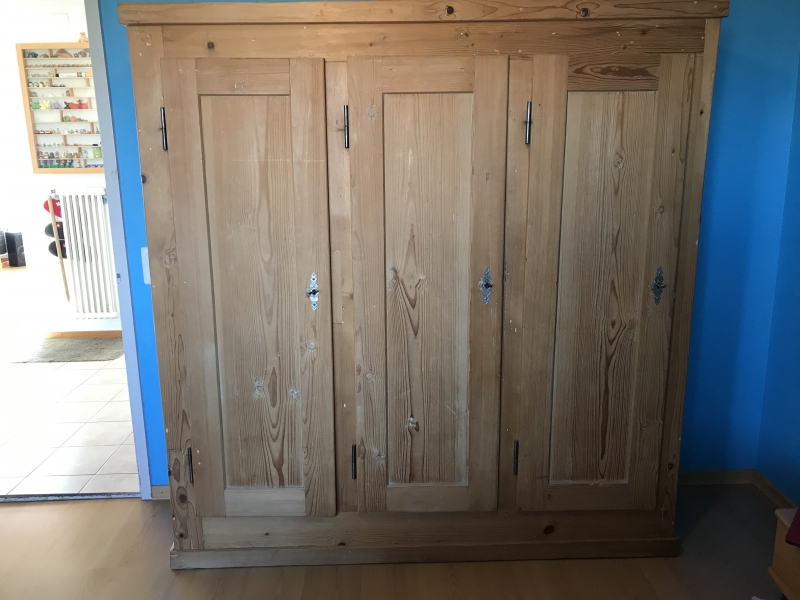Massiver 3 türiger Holzschrank aus Tanne. Masse: 178cm hoch, 184cm lang und 50cm breit. NICHT ZERLEGBAR. Hat einen fleck am Boden.