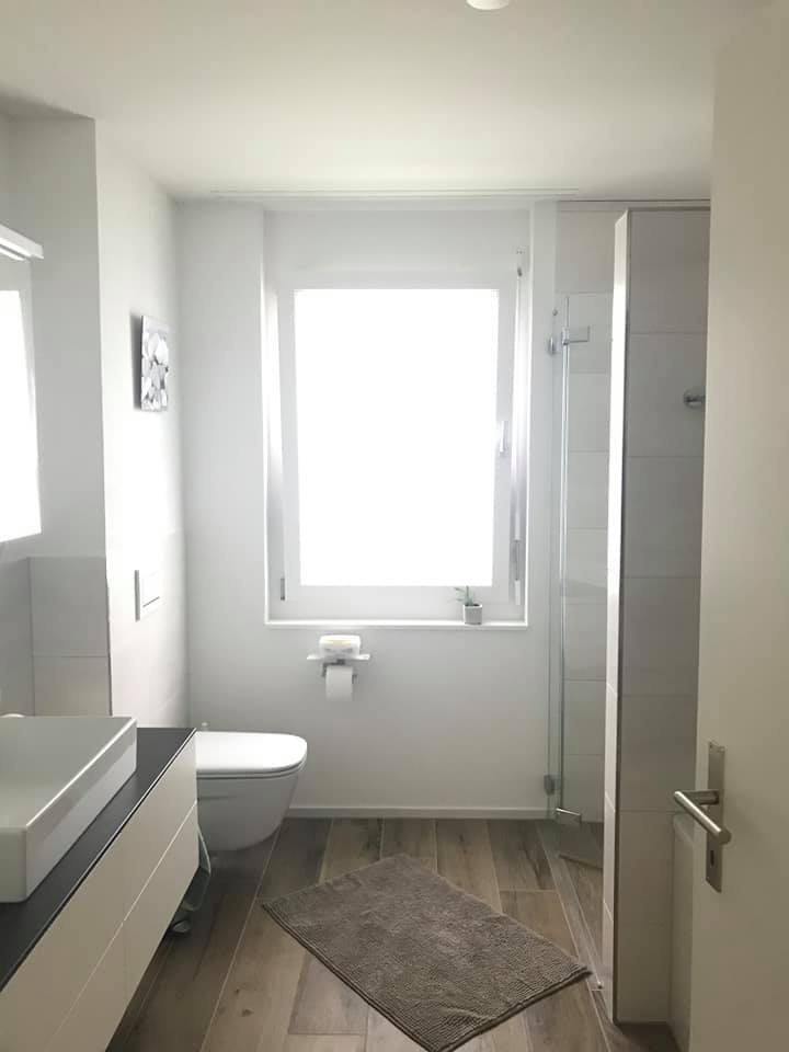 - Badezimmer (7.5 m2) mit Badewanne, Dusche, WC, 3-türiger Spiegelschrank, Lavabo mit Abstellfläche, Unterschrank mit 4 Schubladen und Hochschrank