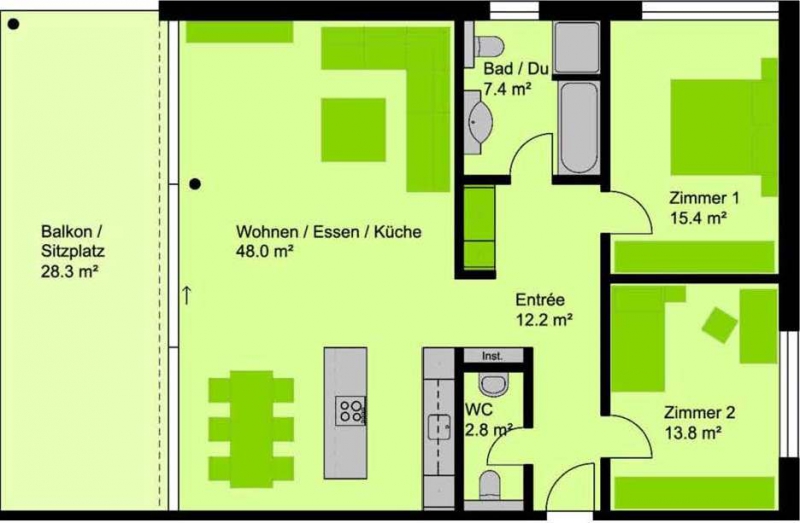 - Grosszügiger, offener Wohn-/Ess-/Küchenbereich (48 m2) mit Zugang zu grossem Sitzplatz (28 m2)