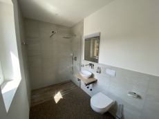 Das Badezimmer ist mit einer grosszügigen bodenebenen Dusche ausgestattet. Der Boden im Bad ist mit Steinteppich aus Marmorkies beschichtet. Ein eigener Wäschebereich steht Ihnen zu privater Nutzung zur Verfügung.