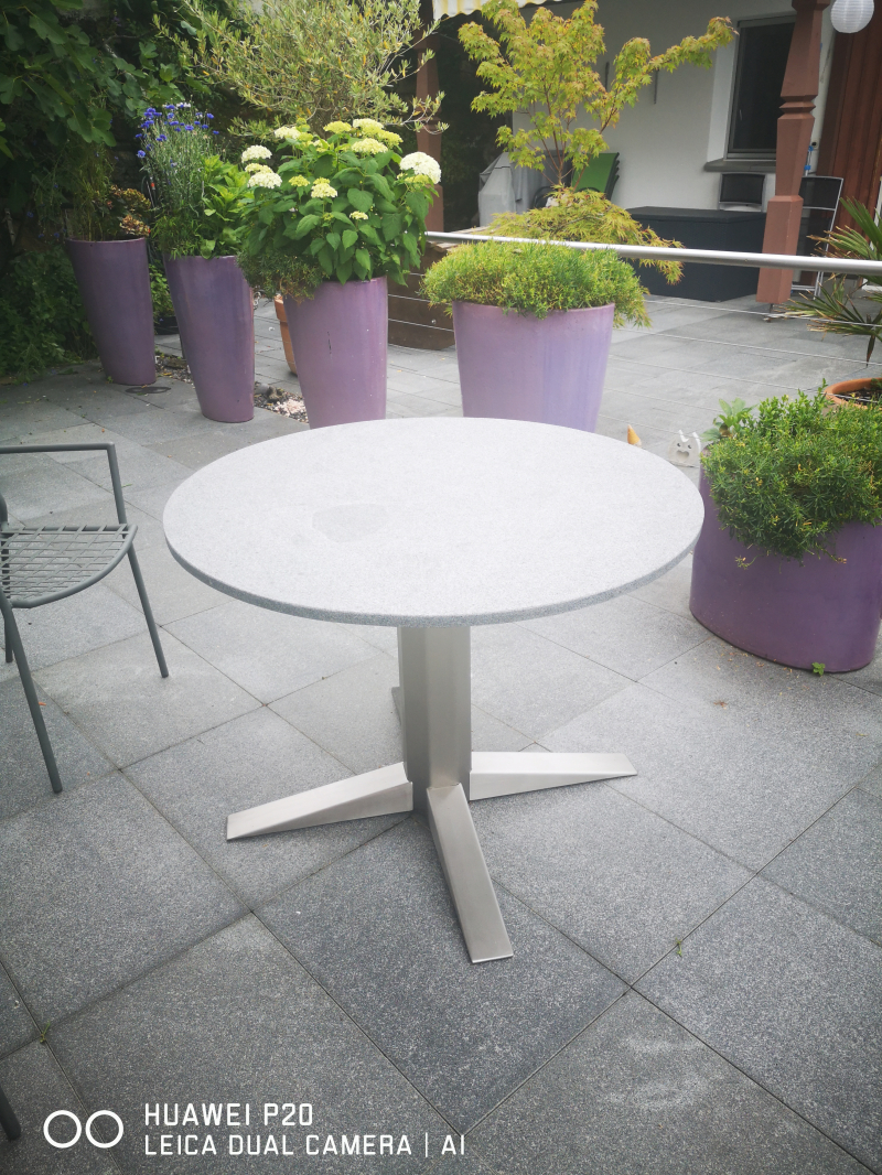 Aus Lagerauflösung nur noch 1 Tisch - wunderschöner runder Granittisch mit rostfreien VA-Stahl Gestell. Platte hellgrau Oberfläche poliert oder Platte dunkelgrau Oberfläche geflammt+gebürstet. Kanten poliert., noch auswählbar. Durchmesser 100cm. Gewicht Platte nur 60kg. Ab Lager 6064 Kerns abholbar.