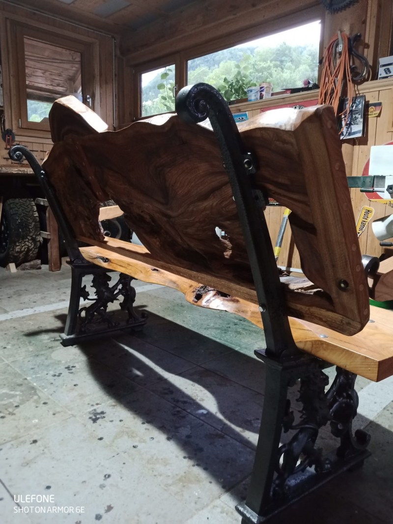 Diese schöne Bank , mit Löwenmotiv, stand einst in einem Schlossgarten . Das Gestell mit dem ,,Zürileu ,, wurde etwa um 1890 hergestellt. Jetzt wurde sie revidiert . Das Holz der Lehne ist Ulmenwurzelholz und die Sitzfläche Kirschbaum .