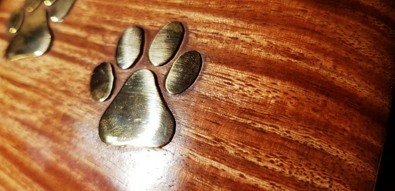 Diese schöne Urne ist aus Sheesham Holz gefertigt. Auf der Oberseite sind zwei Pfoten aus Messing eingelegt. Die Urne ist ca. 12.7 cm lang, 7.7 cm breit und 5.5 cm hoch (Grösse S). Die Ecken der Urne sind mit Messing-Einlagen verziert. Die Urne wird auf der Unterseite mit einem Schiebedeckel geöffnet, welcher durch eine Schraube gesichert ist. Wenn die Sonne auf das Holz scheint, erhält das Holz einen goldbraunen Glanz (wie auf den Fotos zu sehen ist). Das Porto beträgt 7.-. Die gleiche Urne ist auch in Grösse M erhältlich.