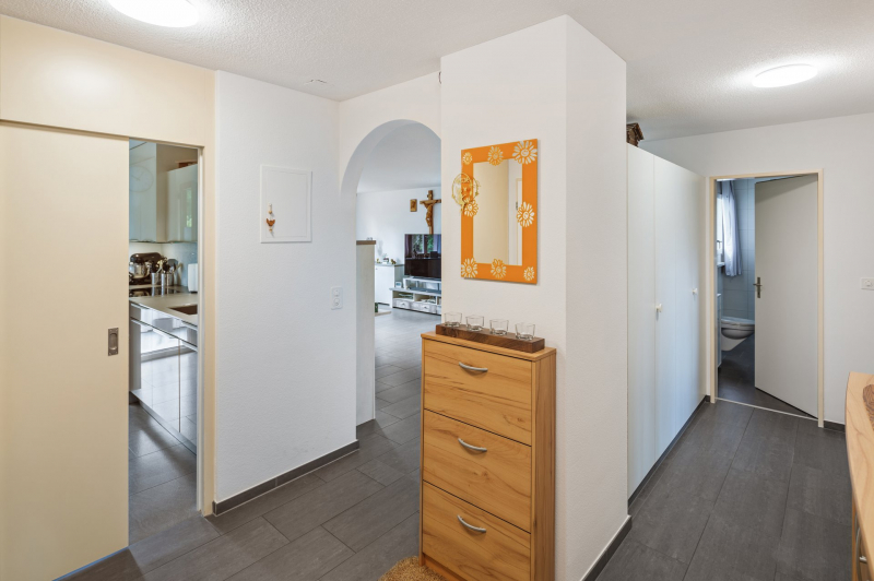 Die Wohnung begeistert mit dem behaglichen Wohngefühl, dem ästhetischen Innenausbau und dem durchdachten Grundriss, der eine optimale Privatsphäre schafft. Die separate Küche ist gleich beim einladenden Entrée angeordnet. Die Fenstertüren bieten Zugang direkt auf den grossen verglasten Balkon mit herrlicher Aussicht in die Berge. Vom grosszügigen, lichtdurchfluteten Wohnzimmer/Esszimmer gelangen Sie seitlich ebenfalls auf den sonnigen Balkon. Die drei freundlichen Schlafzimmer und eine Gästetoilette sind beim Korridor platziert. Das Badezimmer verfügt über ein Doppellavabo und verglaste Dusche. Ein Aussenparkplatz kann für Fr. 55.- gemietet werden.