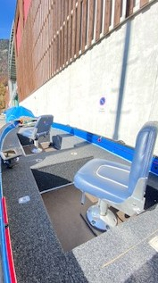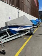 Bodenlicht Blau, 2 USB-Anschluss, Kühlbox Anschluss, 2 Batterien mit Ladegerät, Anker und 4 Schwimmwesten, Positionslicht, 3 Ruten Halter, Badeleiter Ganz Persenning neu, Anker, Hafentrailer