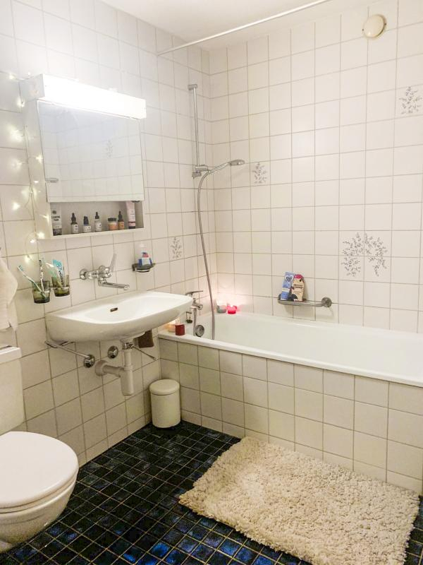 - Badezimmer mit WC, Lavabo, Spiegelschrank und Badewanne