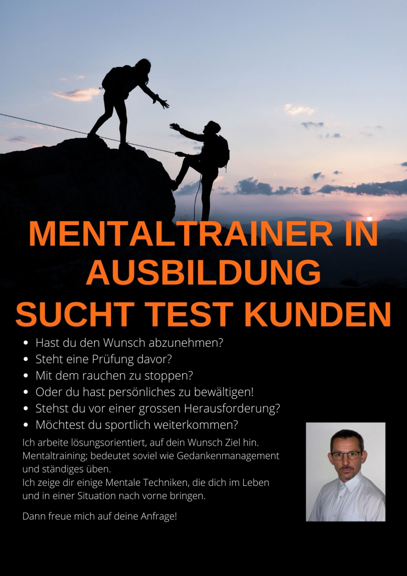 Ich arbeite lösungsorientiert, auf dein Wunsch Ziel hin. Mentaltraining; bedeutet so viel wie Gedankenmanagement und ständiges üben. Ich zeige dir einige Mentale Techniken, die dich im Leben und in einer Situation nach vorne bringen. Ich freue mich auf deinen Anruf!
