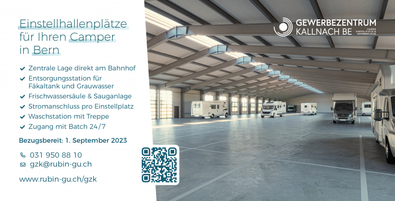Die aussergewöhnlichen Einstellplätze inkl. «Rundum-Sorglos-Paket» sind ab dem 1. Oktober 2023 bezugsbereit. Es hat noch letzte frei Plätze. Reservieren Sie jetzt bequem unter folgemdem Link Ihren sicheren Einstellplatz: https://rubin-gu.ch/gewerbezentrum-kallnach/interessentenformular-halleneinstellplatz/