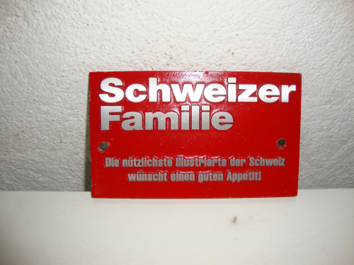 Verkaufe ein Schild mit der Aufschrift Schweizer Familie mit den Massen: Länge 16.5cm Breite 10cm in einem neuwertigen zustand, Vorauszahlung zuzüglich 7.- Versand.