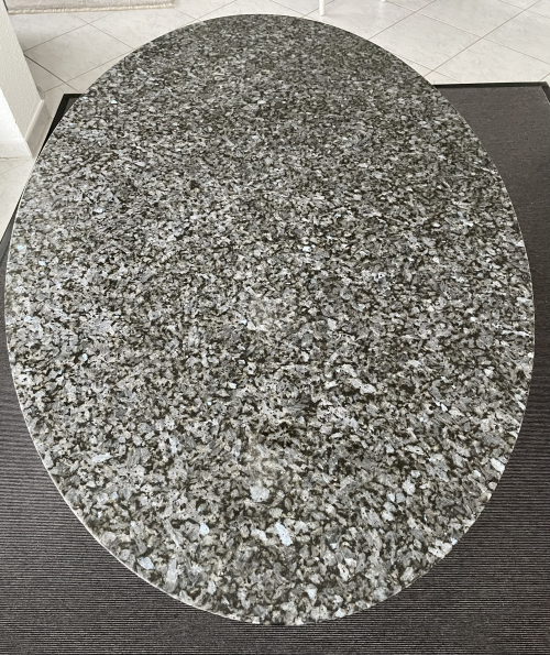 Ovaler, ausziehbarer Granit-Esstisch, mit zwei Einlagebretter.