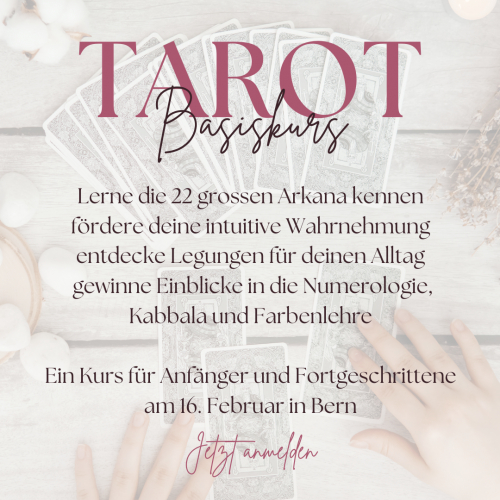 Entdecke die faszinierende Welt der Tarotkarten im Basiskurs, der sich den 22 großen Arkana widmet. Tauche ein in die Geheimnisse der Numerologie, Kabbala und Farbenlehre, um ein tieferes Verständnis für die Symbolik der Karten zu entwickeln, fördere deine intuitive Wahrnehmung und entdecke Legungen für deinen Alltag. Der Kurs bietet dir einen umfassenden Einblick und findet am Freitag, den 16. Februar, von 9:00 bis 16:00 in Bern statt. Die Anzahl Plätze ist limitiert.