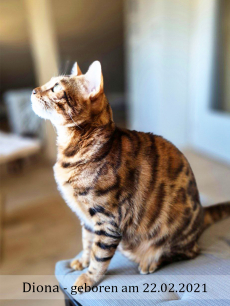 Diona ist ca. 3.5 Jahre alt (02.2021) , spielt ebenfalls sehr gerne und liebt es gestreichelt zu werden. Bengaltypisch aber nur dann wenn SIE will: -) Diona ist etwas kräftiger aber trotzdem sehr schnell und aktiv (wenn man sie fordert) . Diona ist die Tochter von Leeloo - daher kommen die beiden ganz gut zusammen aus. Diona ist aktuell noch nicht kastriert da sie Schwanger war. Sollten Sie sie nicht noch einmal decken wollen, empfielt es sich sie ebenfalls noch zu kastrieren.