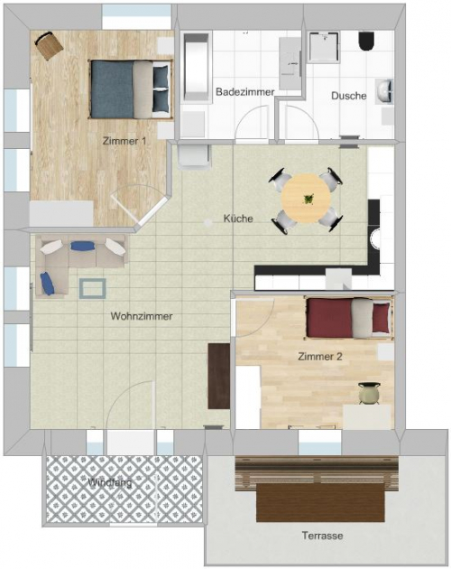 Spezielle 3.5-Zimmer-Wohnung (Wohnfläche ca. 90m2) ehemaliges Restaurant. Im Erdgeschoss mit Terrasse/Sitzplatz. Separater Eingang mit Windfang (Wintergarten).
