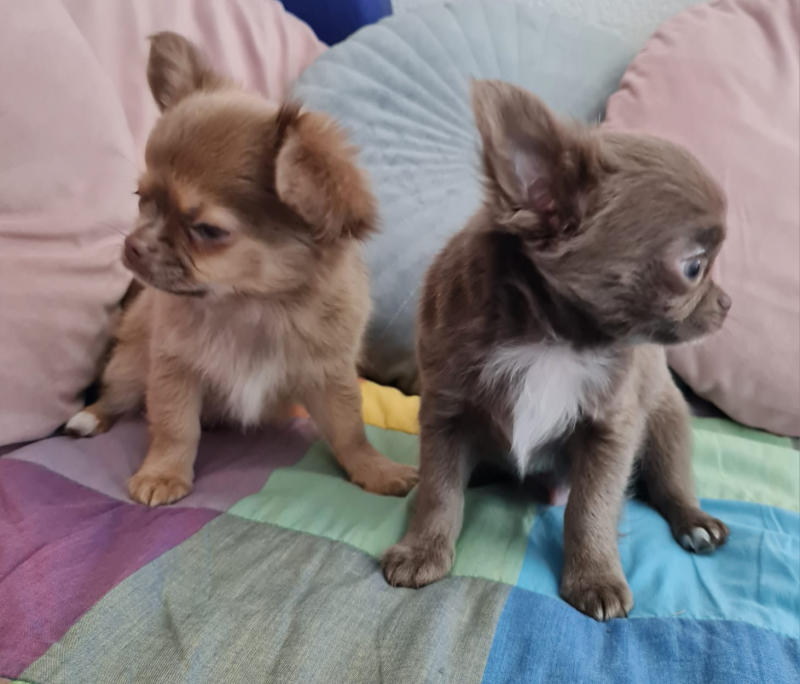 Wir haben 3 wunderschöne Chihuahua Welpen (M) 2 lillac und 1 Isabell-Farbe alle langhaarig, sie sind am 18 Juli geboren und dürfen ab dem 25 September abgegeben werden. Die Welpen wachsen inmitten der Familie auf und sind an Kinder und anderen Tieren gewöhnt. Sie sind sehr lebhaft, neugierig und möchten viel kuscheln. Die Hunde haben einen Stammbaum und auch eine DNA-Analyse, sie werden geimpft, gechippt und entwurmt abgegen.