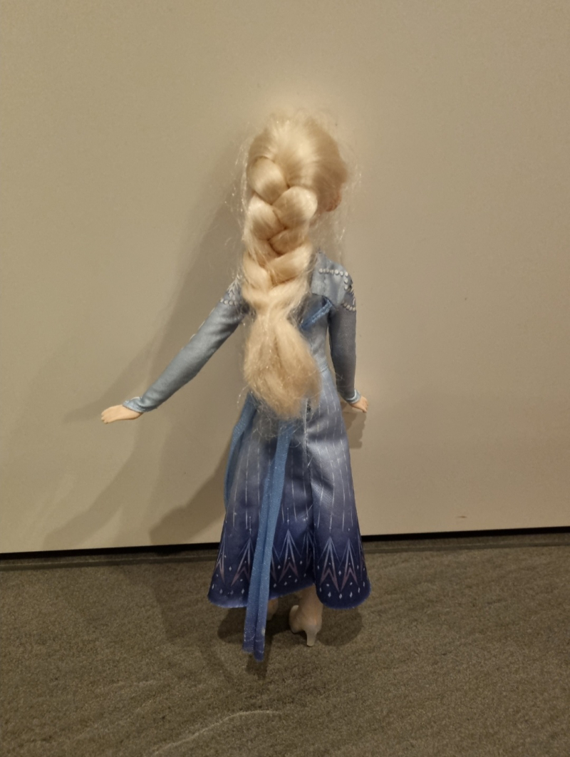 Singende Elsa mit langen, blonden Haaren, die zu einem Zopf geflochten sind. Sie trägt ein wunderschönes Outfit passend zum Film.