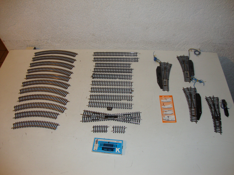 Verkaufe gebrauchtes Märklin K-Geleise HO Wechselstrom aus Nachlass: 11 Stück gebogene Geleise 11gerade Geleise 1 Kreuzung 4 elektrische Weichen 1 Entkupplungsgeleise Märklin 2197 alle Schienen sind nicht getestet ohne Garantie Vorauszahlung zuzüglich 11.50 Versand.