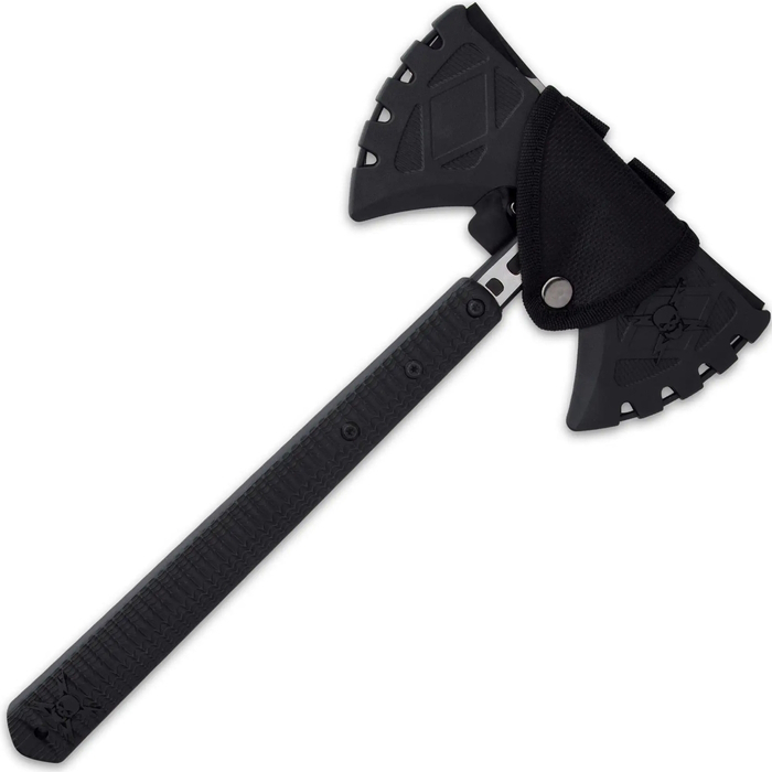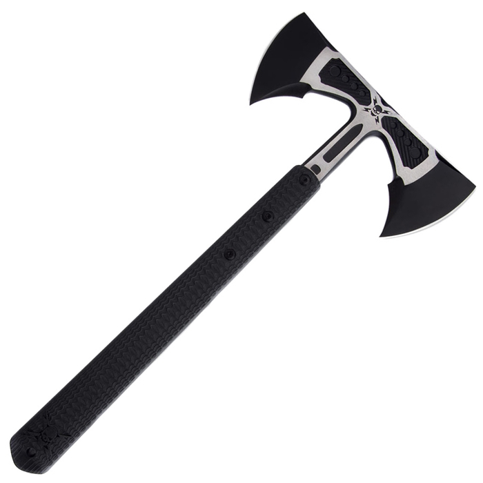 Der M48 Liberator ist ein Infanterie Tomahawk mit einem ca. 19.5 cm langen Doppelaxtkopf aus rostfreiem Gussstahl mit schwarzer Oxidbeschichtung und satinierter Oberfläche. Der Tomahawk hat auf jeder Seite eine ca. 9 cm lange, rasiermesserscharfe Schneide, und auf dem Kopf sind Kreismuster und das M48-Logo eingelassen. Der robuste, glasfaserverstärkte Griff hat eine speziell entworfene, grobe Textur für einen rutschfreien Halt. Der Schaft ist durch drei hochbelastbare Schrauben am Kopf befestigt. Der ca. 39,5 cm lange Tomahawk mit Doppelaxtkopf passt in eine robuste Klingenscheide aus Vortec und Nylon, die mit einer Gürtelschlaufe versehen ist und so das Tragen erleichtert.