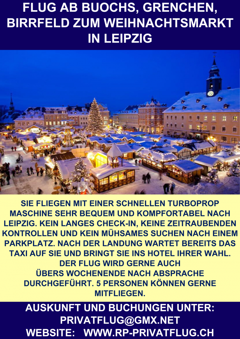 SWISS PRIVATE FLYING FLIEGT JEDERZEIT NACH ABSPRACHE AB DEN FLUGPLÄTZEN BUOCHS, GRENCHEN UND BIRRFELD ZU DEN VERSCHIEDENEN WEIHNACHTSMÄRKTEN 2025 IN DEUTSCHLAND UND ÖSTERREICH.