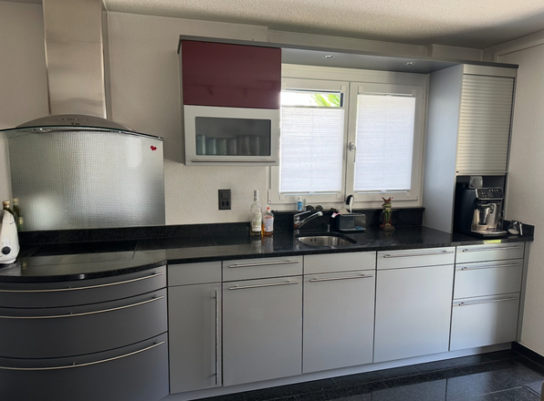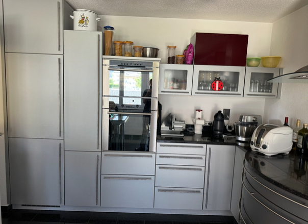 Schubladen mit Blum-System (Soft Close). Viele Schubladen im Innern. Vorratsschrank mit Innenschubladen. Drehtablare in der Ecke. 2xBesteckeinsatz. 3xHandtuchhalter. Hängeschränke mit Glastablaren. Eingebaute Beleuchtung. Kühlschrank V-Zug mit Gefrierfach. V-Zug Backofen. V-Zug Steamer. V-Zug Dunstabzugshaube in Glasoptik, V-Zug Glaskeramik Kochfeld. Abdeckung aus Granitstein. Es gibt noch einen passenden Hochschrank dazu.