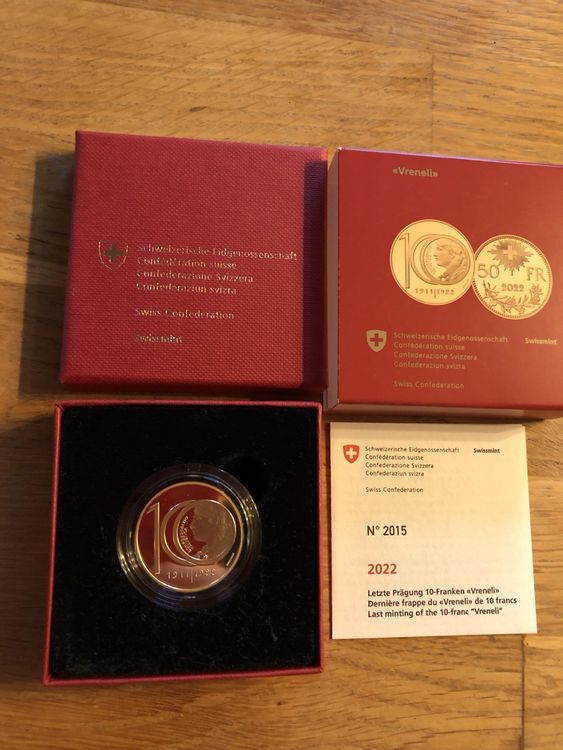 Die kleine Schwester der beliebten 20 Franken Vreneli ist die 10 Franken Vreneli und wurde von 1911-1922 hergestellt. Die Münze ist zudem viel seltener als sein 20 Franken Pendant. Anlässlich des 100. Jubiläums der letzten Prägung der 10 Franken Vreneli gibt die Swiss Mint nun diese besondere Münze "Gold Vreneli - 100 Jahre Jubiläum - 50 Franken PP - 2022" in der höchsten Prägequalität polierte Platte aus. Die Polierte Platte (PP) ist bei Sammlern besonders begehrt und zählt zu den aufwändigsten Herstellungsverfahren einer Münze. Die Sonderedition ist bedeutend grösser als der originale 10 Franken Vreneli und zeigt die Jubiläumsmünze eingebettet in die Zahl 100.