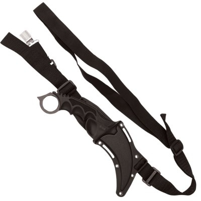 Honshu Karambit Messer schwarz von United Cutlery mit rasiermesserscharfer 7Cr13-Edelstahlklinge, spritzgegossenem TPR-Griff und Knaufring für sicheren Halt. Seine verbogene ca. 10 cm lange Klinge zerschneidet fast alles und der 12 cm lange Griff sitzt perfekt in jeder Hand. Das zirka 22 cm lange Messer wird mit einer Stiefelscheide aus Leder mit Befestigungsclip geliefert.