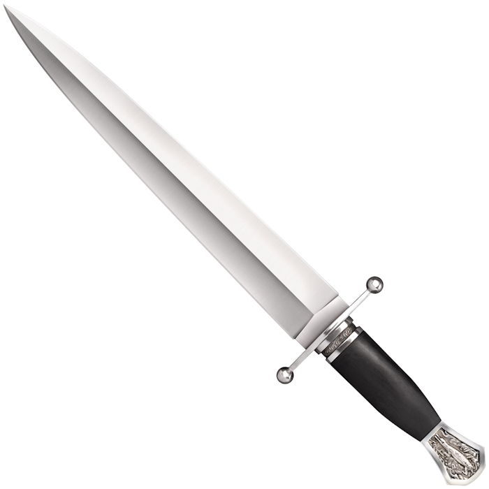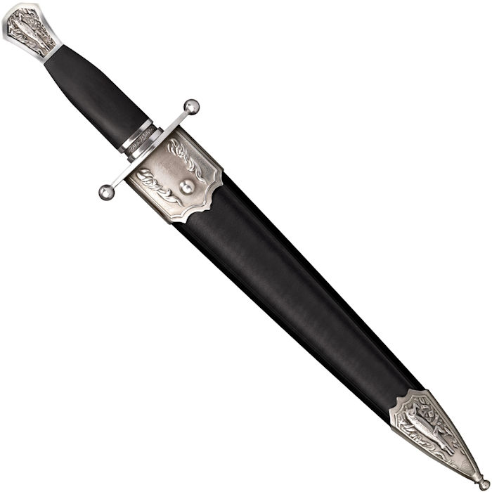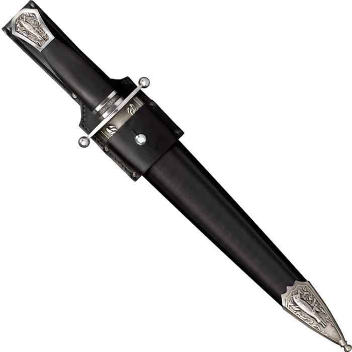 Das zweischneidige Arkansas Toothpick von Cold Steel hat eine kräftige Speerspitze mit einem Griff aus malaysischem Salholz und einem ausgefallenen Knauf mit Alligatormotiv. Die Scheide ist ebenfalls aufwendig gestaltet. Sie ist fein gearbeitet und dekorativ verziert, um den Griff zu ergänzen.
