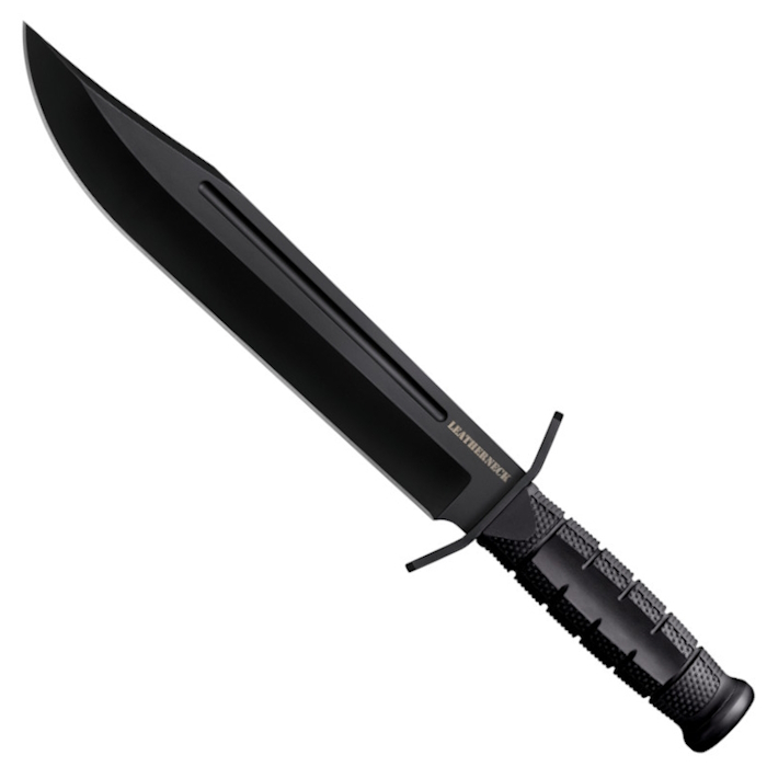 Das Leatherneck Bowie hat eine ca. 26,7 cm lange Klinge im Bowie-Stil aus deutschem D2-Stahl und hat eine nicht-reflektierende schwarze Oberfläche. Die Klinge weist entlang des Großteils ihrer Länge eine markante Hohlklinge auf und ist natürlich rasiermesserscharf. Der Kray-Ex™ Griff basiert auf dem Standarddesign Cold Steels anderer Leathernecks, ist aber mit einer längeren und nach vorne gebogenen Parierstange ausgestattet. Das Messer wird mit einer Secure-Ex™ Scheide geliefert.
