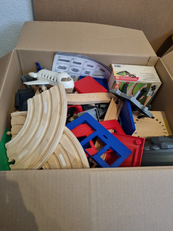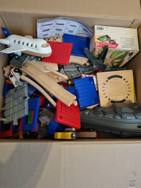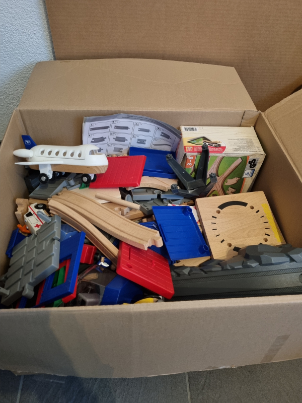Eisenbahn mit Holzschienen und viel Zubehör wie z.B. einen Hafen oder Flugzeugtower. Die Kinder können ganze Welten erstellen.
