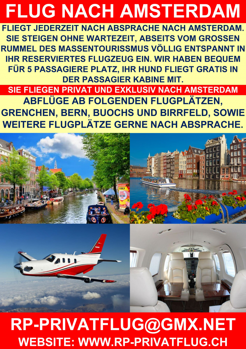 SWISS PRIVATE FLYING FLIEGT JEDERZEIT NACH ABSPRACHE AB DEN FLUGPLÄTZEN BUOCHS, GRENCHEN, BERN UND BIRRFELD NACH AMSTERDAM.