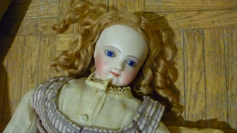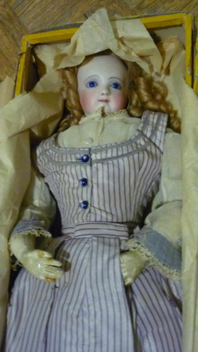 Puppe zu identifizieren: Porzellankopf, Lederkörper, Kleidung und Schachtel. 51 cm lang. Schachtel beschädigt.