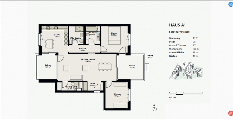 • Innenfläche 106 m²,2 Balkone(25 m²),privater Garten(43 m²),Keller(8 m²) & (optional)Parkplatz in Tiefgarage(15 m²); • Die Innenfläche besteht aus: 2 großen Schlafzimmern, großem Wohnzimmer, Küche/Esszimmer, 2 Badezimmern/WCs (eines mit Badewanne, eines mit Dusche), Korridor vor diesen Badezimmern, Reduit/Waschküche und Eingangsbereich; ); • Fußbodenheizung mit Wärmepumpe–kostengünstiger Betrieb; • Hochwertiges Parkett(wasserfest), Fliesen in Nassbereichen; • Geräumige Küchenschränke; Eingangs- & Waschküchenschränke; • Hochwertige Geräte von V-Zug: Backofen/Dampfgarer,CookTop Glaskeramik Induktion,Dunstabzugshaube, Geschirrspüler, kombinierter Kühl-/Gefrierschrank (300 l);Waschmaschine & Trockner;• Glasfaser-Internetanschluss; • Aufzug von der Parkgarage/Keller; • Elektrisch betriebene Rollläden; Vorinstallierte Vorhangschienen; • Einkaufsmöglichkeiten/öffentliche Verkehrsmittel/Schulen/Kindergärten befinden sich in der Nähe; 10 km von Bern (12 min mit dem Auto, 19 min mit dem Zug).