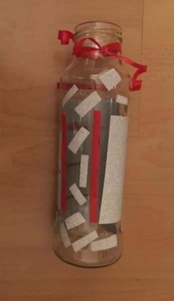 Glasvase für Pflanzen und Blumen, mit Dekofarbe rot und glitzersilber und Maschenband, gemäss Bild.