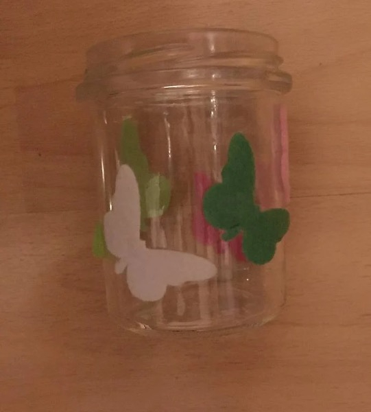 Konfitürenglas leer ohne Deckel, mit Filzschmetterlingen gemäss Bild, Farbe hellgrün, dunkelgrün, pink und rosa. Für Pflanzen und Blumen.