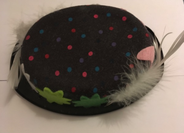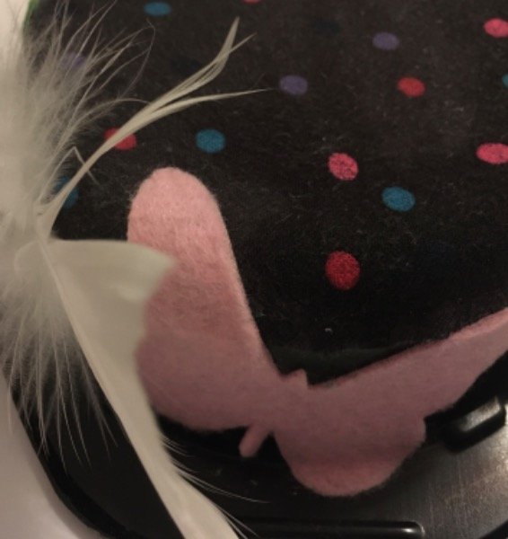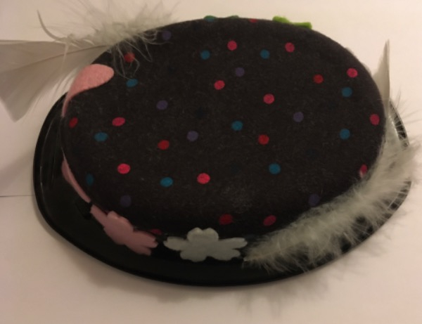 Farbiger Deko Capelllo, schwarzer Plastikdeckel mit farbigem Stoff überzogen und Filz Blumen in der Farbe dunkelgrün, hellgrün, weiss, rosa, und mit rosa Filz Schmetterling