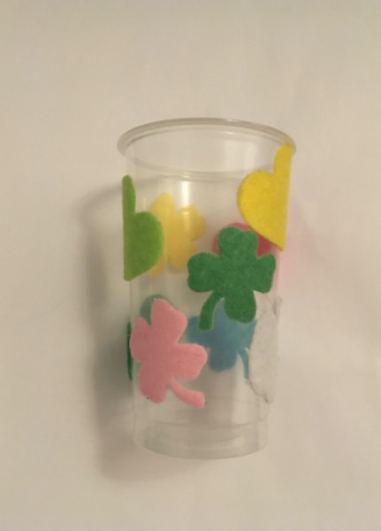 Plastikbecher durchsichtig mit Deko farbigem Filz, in der Farbe gelb, grün, weiss, blau, pink und rosa, gemäss Bild.