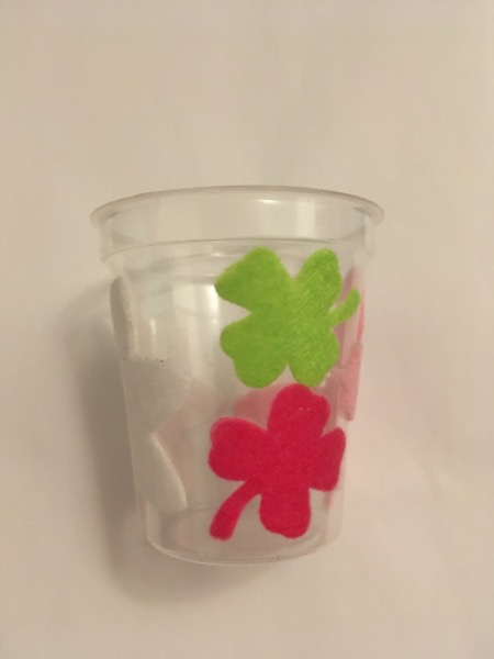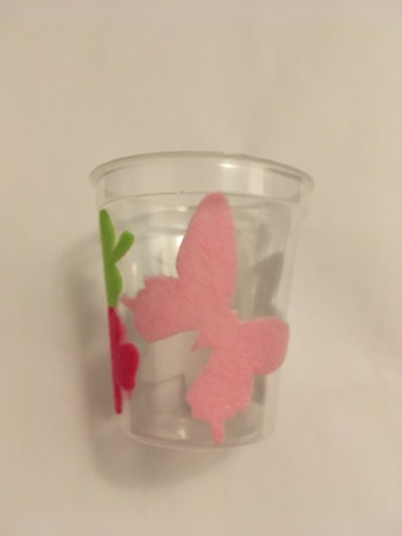 Plastikbecher durchsichtig, mit Deko farbigem Filz rosa, pink, weiss und grün, gemäss Bild.