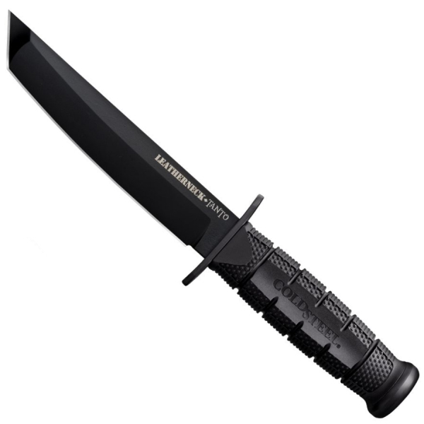 Leatherneck Tanto Kampfmesser 2017er Modell mit scharfer Klinge aus deutschem D2 Werkzeugstahl mit DLC-Beschichtung von Cold Steel. Es verfügt über eine Tanto-Klinge, mit kräftiger verstärkter Spitze. Um zu verhindern, dass die Finger nach vorn rutschen, ist das Leatherneck Tanto mit einem effektiven Parierelement aus massivem Stahl ausgerüstet. Die breite, durchgängige Angel ist von einem Heft aus tief geriffeltem Kray-Ex ummantelt. Die Griffkappe aus Stahl kann notfalls als Hammer eingesetzt werden. Zum sicheren und bequemen Tragen kommt das Messer mit einer vielseitigen Secure-Ex Scheide, inklusive umsetzbarer, voll abnehmbarer Gürtelschlaufe.